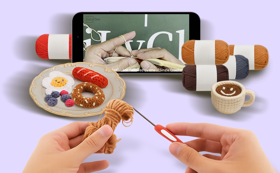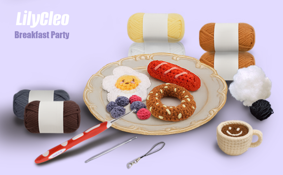 This crochet kit includes 6 adorable items: Coffee, Bagel Piece, Fried Egg, Blueberry, Raspberry, and Sausage. You can complete each piece one at a time, with the simplest taking just 5 minutes to finish. It's perfect for beginners, no need to worry about complicated crochet projects anymore!